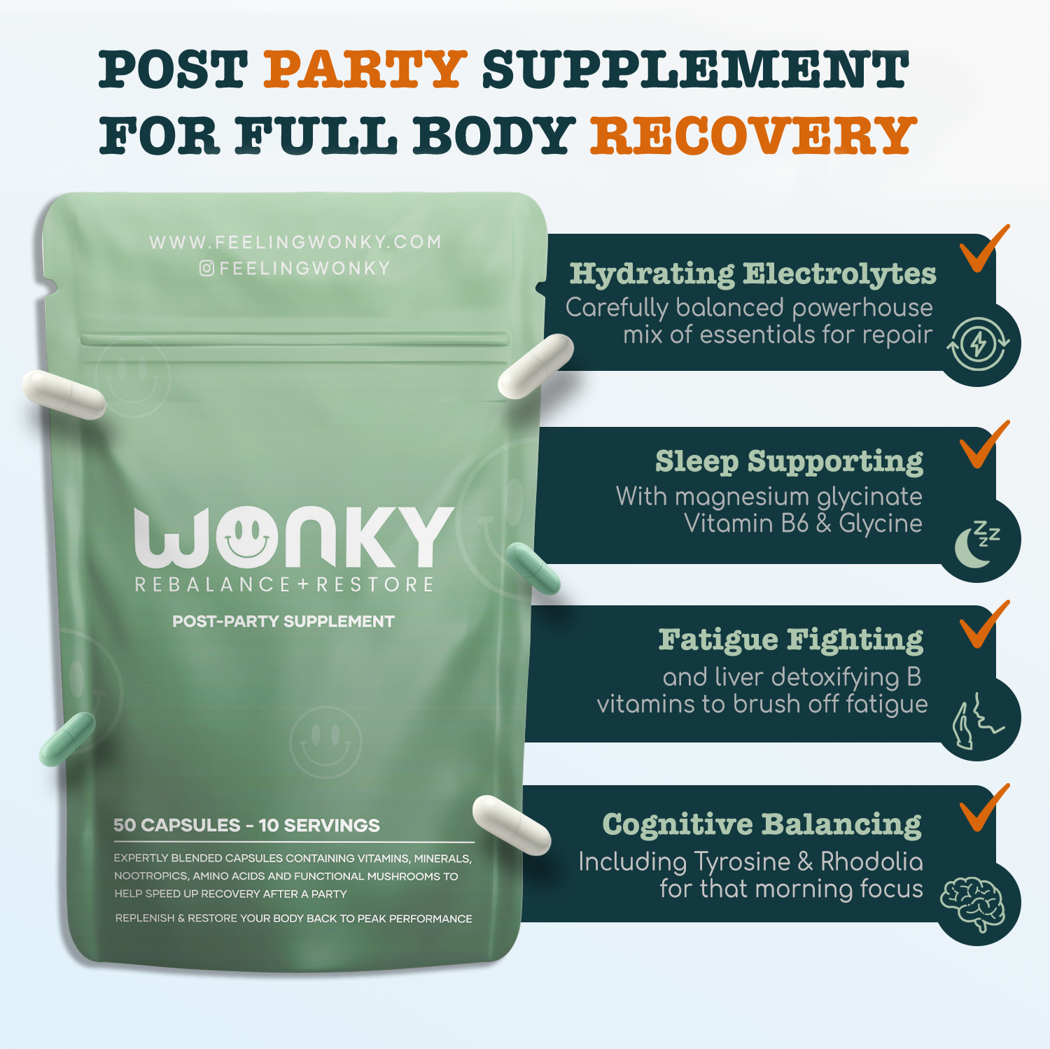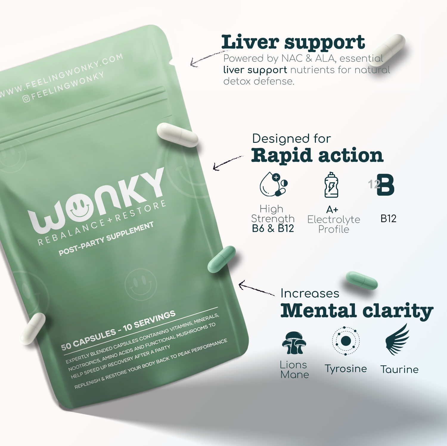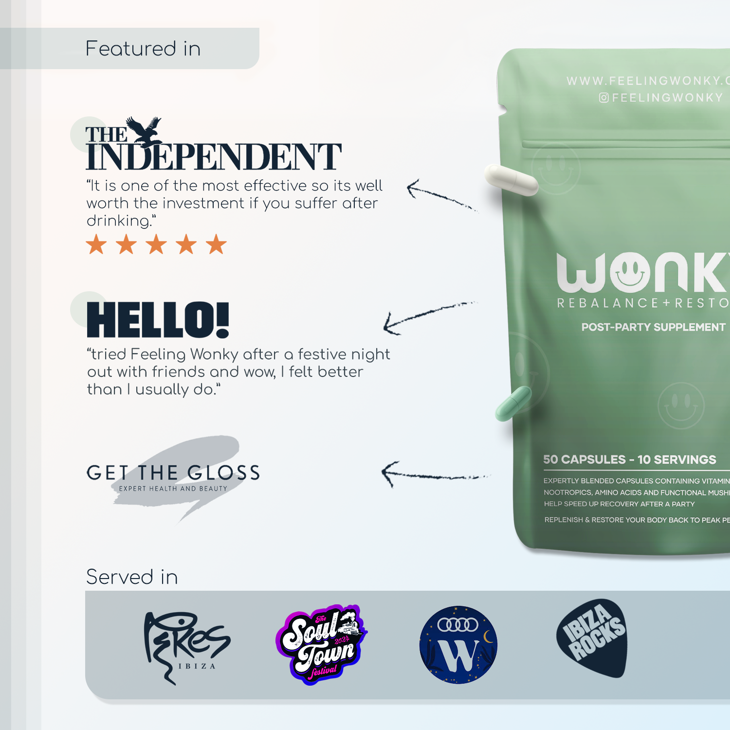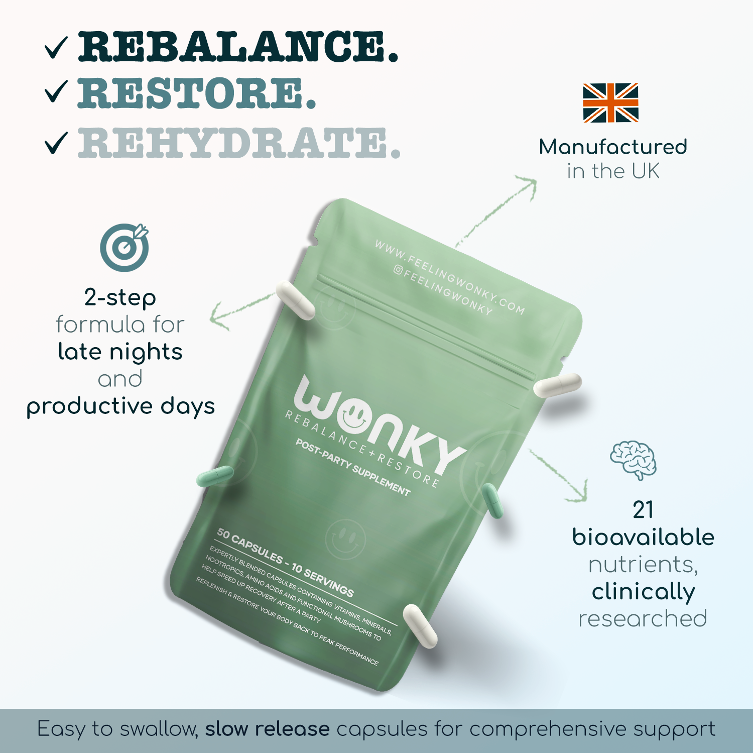 Feeling Wonky was developed for those who enjoy socialising but value their wellbeing the next day. Guided by science and expert formulation, it delivers a simple, effective recovery system that fits seamlessly into modern life.